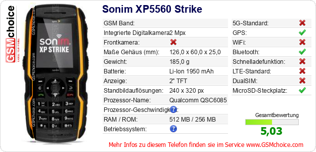 Hast du eigene Webseite? Willst du die Informationen über Standarddaten des Handys Sonim XP5560 Strike irgendwo veröffentlichen? Das ist sehr einfach. Du kannst das Bild herunterladen oder kopieren und auf der Webseite folgenden Code hinzufügen:Das Einfügen von diesem Code verursacht das Anzeigen von dem folgenden Bild: