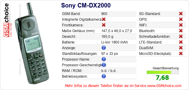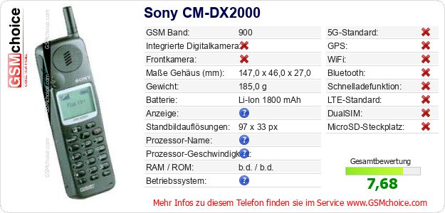 Hast du eigene Webseite? Willst du die Informationen über Standarddaten des Handys Sony CM-DX2000 irgendwo veröffentlichen? Das ist sehr einfach. Du kannst das Bild herunterladen oder kopieren und auf der Webseite folgenden Code hinzufügen:Das Einfügen von diesem Code verursacht das Anzeigen von dem folgenden Bild: