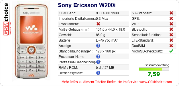 Hast du eigene Webseite? Willst du die Informationen über Standarddaten des Handys Sony Ericsson W200i irgendwo veröffentlichen? Das ist sehr einfach. Du kannst das Bild herunterladen oder kopieren und auf der Webseite folgenden Code hinzufügen:Das Einfügen von diesem Code verursacht das Anzeigen von dem folgenden Bild: