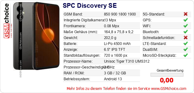 Hast du eigene Webseite? Willst du die Informationen über Standarddaten des Handys SPC Discovery SE irgendwo veröffentlichen? Das ist sehr einfach. Du kannst das Bild herunterladen oder kopieren und auf der Webseite folgenden Code hinzufügen:Das Einfügen von diesem Code verursacht das Anzeigen von dem folgenden Bild: