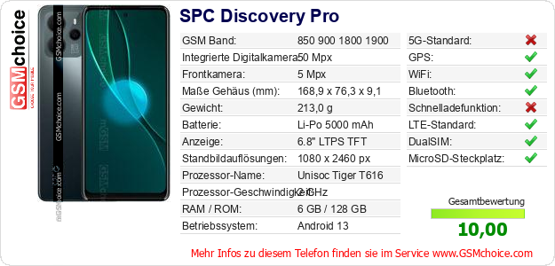 Hast du eigene Webseite? Willst du die Informationen über Standarddaten des Handys SPC Discovery Pro irgendwo veröffentlichen? Das ist sehr einfach. Du kannst das Bild herunterladen oder kopieren und auf der Webseite folgenden Code hinzufügen:Das Einfügen von diesem Code verursacht das Anzeigen von dem folgenden Bild: