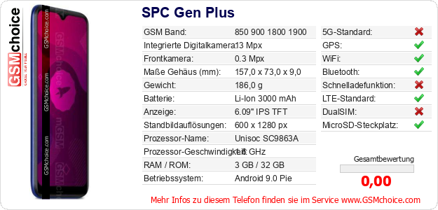Hast du eigene Webseite? Willst du die Informationen über Standarddaten des Handys SPC Gen Plus irgendwo veröffentlichen? Das ist sehr einfach. Du kannst das Bild herunterladen oder kopieren und auf der Webseite folgenden Code hinzufügen:Das Einfügen von diesem Code verursacht das Anzeigen von dem folgenden Bild: