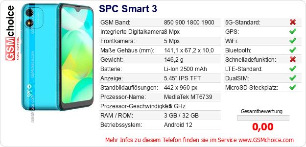 Hast du eigene Webseite? Willst du die Informationen über Standarddaten des Handys SPC Smart 3 irgendwo veröffentlichen? Das ist sehr einfach. Du kannst das Bild herunterladen oder kopieren und auf der Webseite folgenden Code hinzufügen:Das Einfügen von diesem Code verursacht das Anzeigen von dem folgenden Bild: