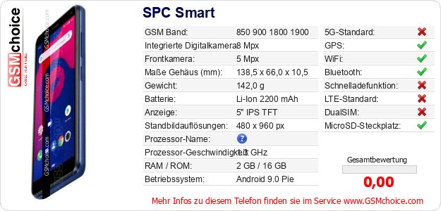 Hast du eigene Webseite? Willst du die Informationen über Standarddaten des Handys SPC Smart irgendwo veröffentlichen? Das ist sehr einfach. Du kannst das Bild herunterladen oder kopieren und auf der Webseite folgenden Code hinzufügen:Das Einfügen von diesem Code verursacht das Anzeigen von dem folgenden Bild: