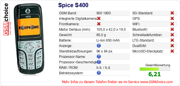 Hast du eigene Webseite? Willst du die Informationen über Standarddaten des Handys Spice S400 irgendwo veröffentlichen? Das ist sehr einfach. Du kannst das Bild herunterladen oder kopieren und auf der Webseite folgenden Code hinzufügen:Das Einfügen von diesem Code verursacht das Anzeigen von dem folgenden Bild: