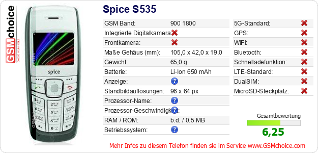 Hast du eigene Webseite? Willst du die Informationen über Standarddaten des Handys Spice S535 irgendwo veröffentlichen? Das ist sehr einfach. Du kannst das Bild herunterladen oder kopieren und auf der Webseite folgenden Code hinzufügen:Das Einfügen von diesem Code verursacht das Anzeigen von dem folgenden Bild: