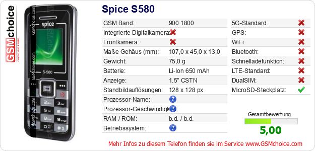 Hast du eigene Webseite? Willst du die Informationen über Standarddaten des Handys Spice S580 irgendwo veröffentlichen? Das ist sehr einfach. Du kannst das Bild herunterladen oder kopieren und auf der Webseite folgenden Code hinzufügen:Das Einfügen von diesem Code verursacht das Anzeigen von dem folgenden Bild: