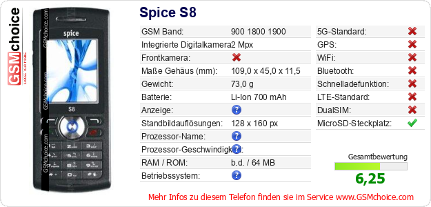 Hast du eigene Webseite? Willst du die Informationen über Standarddaten des Handys Spice S8 irgendwo veröffentlichen? Das ist sehr einfach. Du kannst das Bild herunterladen oder kopieren und auf der Webseite folgenden Code hinzufügen:Das Einfügen von diesem Code verursacht das Anzeigen von dem folgenden Bild: