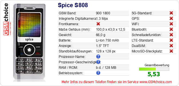 Hast du eigene Webseite? Willst du die Informationen über Standarddaten des Handys Spice S808 irgendwo veröffentlichen? Das ist sehr einfach. Du kannst das Bild herunterladen oder kopieren und auf der Webseite folgenden Code hinzufügen:Das Einfügen von diesem Code verursacht das Anzeigen von dem folgenden Bild: