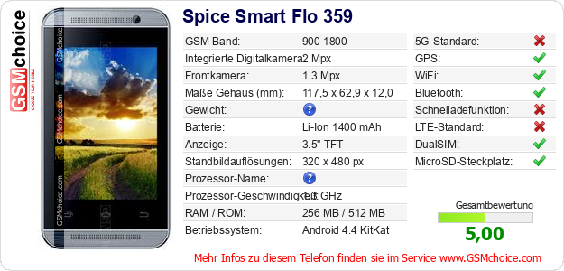 Hast du eigene Webseite? Willst du die Informationen über Standarddaten des Handys Spice Smart Flo 359 irgendwo veröffentlichen? Das ist sehr einfach. Du kannst das Bild herunterladen oder kopieren und auf der Webseite folgenden Code hinzufügen:Das Einfügen von diesem Code verursacht das Anzeigen von dem folgenden Bild: