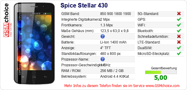 Hast du eigene Webseite? Willst du die Informationen über Standarddaten des Handys Spice Stellar 430 irgendwo veröffentlichen? Das ist sehr einfach. Du kannst das Bild herunterladen oder kopieren und auf der Webseite folgenden Code hinzufügen:Das Einfügen von diesem Code verursacht das Anzeigen von dem folgenden Bild: