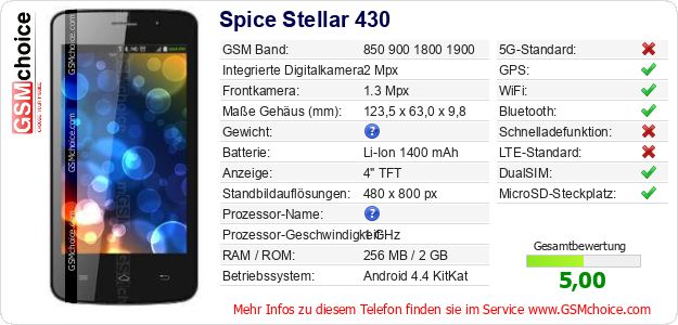 Daten des Mobiltelefons Spice Stellar 430 auf Ihrer Seite