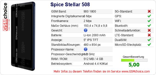Hast du eigene Webseite? Willst du die Informationen über Standarddaten des Handys Spice Stellar 508 irgendwo veröffentlichen? Das ist sehr einfach. Du kannst das Bild herunterladen oder kopieren und auf der Webseite folgenden Code hinzufügen:Das Einfügen von diesem Code verursacht das Anzeigen von dem folgenden Bild: