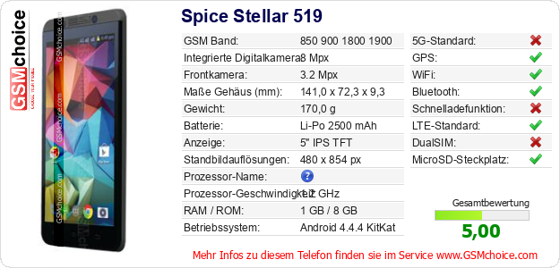 Hast du eigene Webseite? Willst du die Informationen über Standarddaten des Handys Spice Stellar 519 irgendwo veröffentlichen? Das ist sehr einfach. Du kannst das Bild herunterladen oder kopieren und auf der Webseite folgenden Code hinzufügen:Das Einfügen von diesem Code verursacht das Anzeigen von dem folgenden Bild: