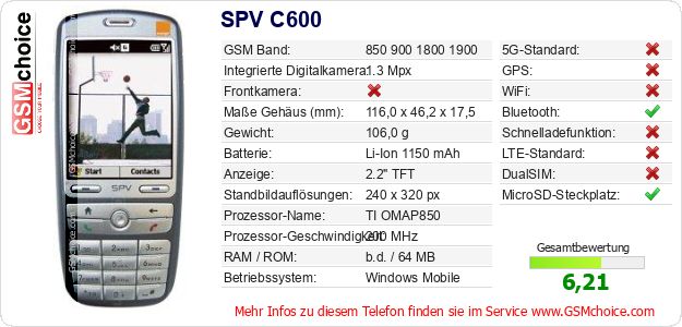 Hast du eigene Webseite? Willst du die Informationen über Standarddaten des Handys SPV C600 irgendwo veröffentlichen? Das ist sehr einfach. Du kannst das Bild herunterladen oder kopieren und auf der Webseite folgenden Code hinzufügen:Das Einfügen von diesem Code verursacht das Anzeigen von dem folgenden Bild: