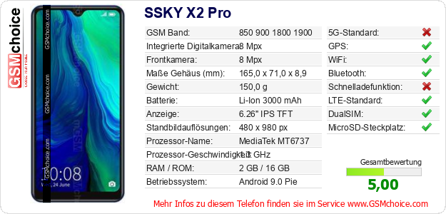 Hast du eigene Webseite? Willst du die Informationen über Standarddaten des Handys SSKY X2 Pro irgendwo veröffentlichen? Das ist sehr einfach. Du kannst das Bild herunterladen oder kopieren und auf der Webseite folgenden Code hinzufügen:Das Einfügen von diesem Code verursacht das Anzeigen von dem folgenden Bild: