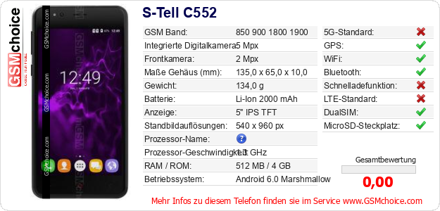 Hast du eigene Webseite? Willst du die Informationen über Standarddaten des Handys S-Tell C552 irgendwo veröffentlichen? Das ist sehr einfach. Du kannst das Bild herunterladen oder kopieren und auf der Webseite folgenden Code hinzufügen:Das Einfügen von diesem Code verursacht das Anzeigen von dem folgenden Bild: