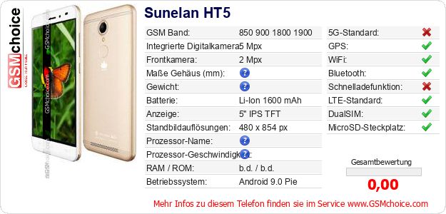 Hast du eigene Webseite? Willst du die Informationen über Standarddaten des Handys Sunelan HT5 irgendwo veröffentlichen? Das ist sehr einfach. Du kannst das Bild herunterladen oder kopieren und auf der Webseite folgenden Code hinzufügen:Das Einfügen von diesem Code verursacht das Anzeigen von dem folgenden Bild: