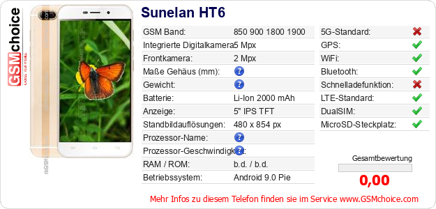 Hast du eigene Webseite? Willst du die Informationen über Standarddaten des Handys Sunelan HT6 irgendwo veröffentlichen? Das ist sehr einfach. Du kannst das Bild herunterladen oder kopieren und auf der Webseite folgenden Code hinzufügen:Das Einfügen von diesem Code verursacht das Anzeigen von dem folgenden Bild: