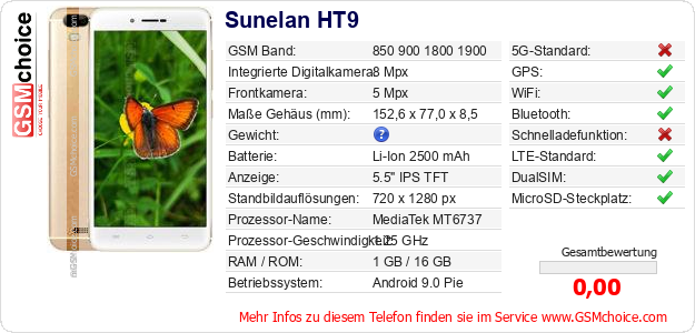 Hast du eigene Webseite? Willst du die Informationen über Standarddaten des Handys Sunelan HT9 irgendwo veröffentlichen? Das ist sehr einfach. Du kannst das Bild herunterladen oder kopieren und auf der Webseite folgenden Code hinzufügen:Das Einfügen von diesem Code verursacht das Anzeigen von dem folgenden Bild: