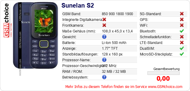 Hast du eigene Webseite? Willst du die Informationen über Standarddaten des Handys Sunelan S2 irgendwo veröffentlichen? Das ist sehr einfach. Du kannst das Bild herunterladen oder kopieren und auf der Webseite folgenden Code hinzufügen:Das Einfügen von diesem Code verursacht das Anzeigen von dem folgenden Bild: