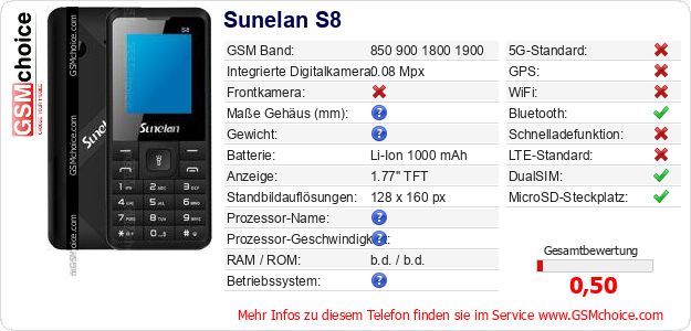 Hast du eigene Webseite? Willst du die Informationen über Standarddaten des Handys Sunelan S8 irgendwo veröffentlichen? Das ist sehr einfach. Du kannst das Bild herunterladen oder kopieren und auf der Webseite folgenden Code hinzufügen:Das Einfügen von diesem Code verursacht das Anzeigen von dem folgenden Bild: