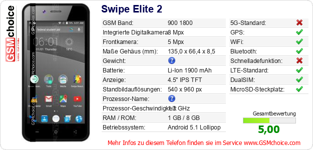 Hast du eigene Webseite? Willst du die Informationen über Standarddaten des Handys Swipe Elite 2 irgendwo veröffentlichen? Das ist sehr einfach. Du kannst das Bild herunterladen oder kopieren und auf der Webseite folgenden Code hinzufügen:Das Einfügen von diesem Code verursacht das Anzeigen von dem folgenden Bild: