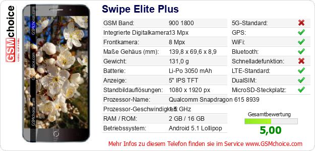 Hast du eigene Webseite? Willst du die Informationen über Standarddaten des Handys Swipe Elite Plus irgendwo veröffentlichen? Das ist sehr einfach. Du kannst das Bild herunterladen oder kopieren und auf der Webseite folgenden Code hinzufügen:Das Einfügen von diesem Code verursacht das Anzeigen von dem folgenden Bild: