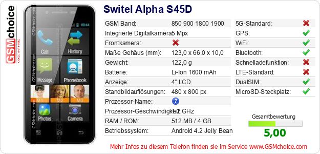 Hast du eigene Webseite? Willst du die Informationen über Standarddaten des Handys Switel Alpha S45D irgendwo veröffentlichen? Das ist sehr einfach. Du kannst das Bild herunterladen oder kopieren und auf der Webseite folgenden Code hinzufügen:Das Einfügen von diesem Code verursacht das Anzeigen von dem folgenden Bild: