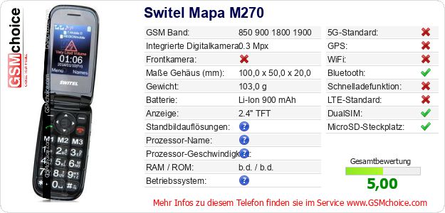 Hast du eigene Webseite? Willst du die Informationen über Standarddaten des Handys Switel Mapa M270 irgendwo veröffentlichen? Das ist sehr einfach. Du kannst das Bild herunterladen oder kopieren und auf der Webseite folgenden Code hinzufügen:Das Einfügen von diesem Code verursacht das Anzeigen von dem folgenden Bild:
