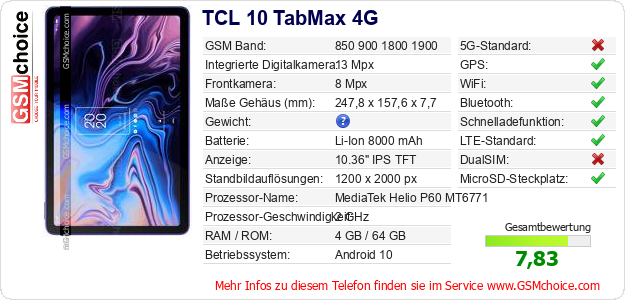 Hast du eigene Webseite? Willst du die Informationen über Standarddaten des Handys TCL 10 TabMax 4G irgendwo veröffentlichen? Das ist sehr einfach. Du kannst das Bild herunterladen oder kopieren und auf der Webseite folgenden Code hinzufügen:Das Einfügen von diesem Code verursacht das Anzeigen von dem folgenden Bild: