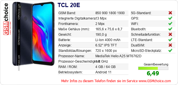 Hast du eigene Webseite? Willst du die Informationen über Standarddaten des Handys TCL 20E irgendwo veröffentlichen? Das ist sehr einfach. Du kannst das Bild herunterladen oder kopieren und auf der Webseite folgenden Code hinzufügen:Das Einfügen von diesem Code verursacht das Anzeigen von dem folgenden Bild: