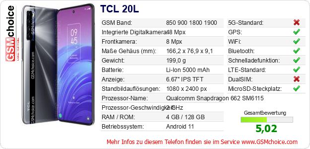 Hast du eigene Webseite? Willst du die Informationen über Standarddaten des Handys TCL 20L irgendwo veröffentlichen? Das ist sehr einfach. Du kannst das Bild herunterladen oder kopieren und auf der Webseite folgenden Code hinzufügen:Das Einfügen von diesem Code verursacht das Anzeigen von dem folgenden Bild: