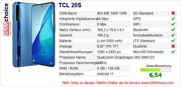 Hast du eigene Webseite? Willst du die Informationen über Standarddaten des Handys TCL 20S irgendwo veröffentlichen? Das ist sehr einfach. Du kannst das Bild herunterladen oder kopieren und auf der Webseite folgenden Code hinzufügen:Das Einfügen von diesem Code verursacht das Anzeigen von dem folgenden Bild: