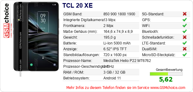 Hast du eigene Webseite? Willst du die Informationen über Standarddaten des Handys TCL 20 XE irgendwo veröffentlichen? Das ist sehr einfach. Du kannst das Bild herunterladen oder kopieren und auf der Webseite folgenden Code hinzufügen:Das Einfügen von diesem Code verursacht das Anzeigen von dem folgenden Bild: