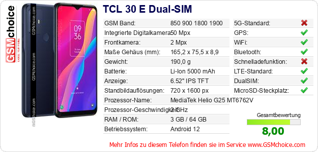 Hast du eigene Webseite? Willst du die Informationen über Standarddaten des Handys TCL 30 E Dual-SIM irgendwo veröffentlichen? Das ist sehr einfach. Du kannst das Bild herunterladen oder kopieren und auf der Webseite folgenden Code hinzufügen:Das Einfügen von diesem Code verursacht das Anzeigen von dem folgenden Bild: