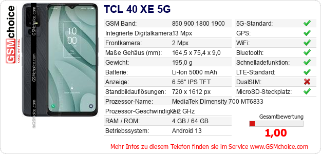 Hast du eigene Webseite? Willst du die Informationen über Standarddaten des Handys TCL 40 XE 5G irgendwo veröffentlichen? Das ist sehr einfach. Du kannst das Bild herunterladen oder kopieren und auf der Webseite folgenden Code hinzufügen:Das Einfügen von diesem Code verursacht das Anzeigen von dem folgenden Bild: