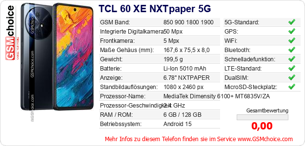 Daten des Mobiltelefons TCL 60 XE NXTpaper 5G auf Ihrer Seite