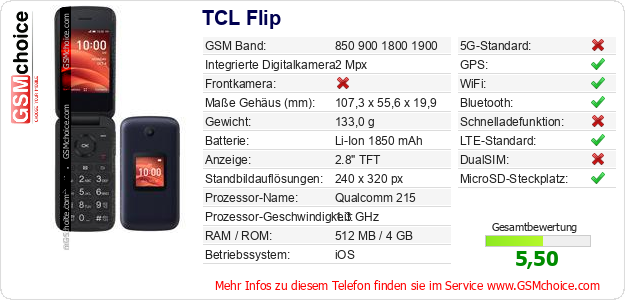 Hast du eigene Webseite? Willst du die Informationen über Standarddaten des Handys TCL Flip irgendwo veröffentlichen? Das ist sehr einfach. Du kannst das Bild herunterladen oder kopieren und auf der Webseite folgenden Code hinzufügen:Das Einfügen von diesem Code verursacht das Anzeigen von dem folgenden Bild: