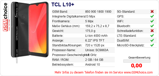 Hast du eigene Webseite? Willst du die Informationen über Standarddaten des Handys TCL L10+ irgendwo veröffentlichen? Das ist sehr einfach. Du kannst das Bild herunterladen oder kopieren und auf der Webseite folgenden Code hinzufügen:Das Einfügen von diesem Code verursacht das Anzeigen von dem folgenden Bild: