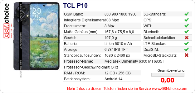 Hast du eigene Webseite? Willst du die Informationen über Standarddaten des Handys TCL P10 irgendwo veröffentlichen? Das ist sehr einfach. Du kannst das Bild herunterladen oder kopieren und auf der Webseite folgenden Code hinzufügen:Das Einfügen von diesem Code verursacht das Anzeigen von dem folgenden Bild:
