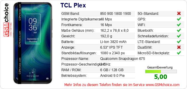 Hast du eigene Webseite? Willst du die Informationen über Standarddaten des Handys TCL Plex irgendwo veröffentlichen? Das ist sehr einfach. Du kannst das Bild herunterladen oder kopieren und auf der Webseite folgenden Code hinzufügen:Das Einfügen von diesem Code verursacht das Anzeigen von dem folgenden Bild: