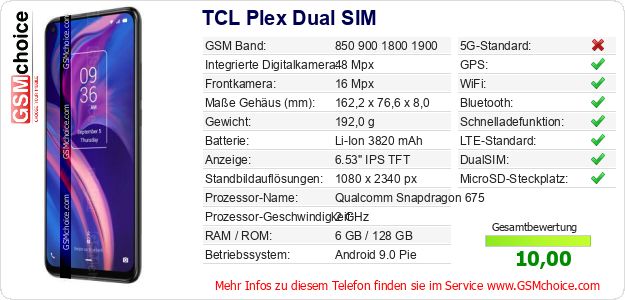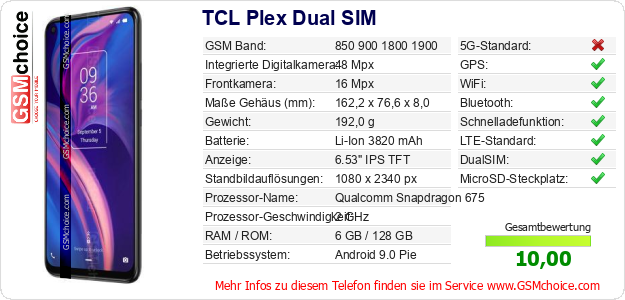 Hast du eigene Webseite? Willst du die Informationen über Standarddaten des Handys TCL Plex Dual SIM irgendwo veröffentlichen? Das ist sehr einfach. Du kannst das Bild herunterladen oder kopieren und auf der Webseite folgenden Code hinzufügen:Das Einfügen von diesem Code verursacht das Anzeigen von dem folgenden Bild: