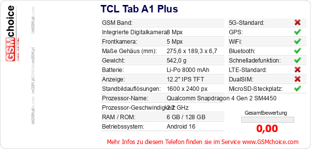 Hast du eigene Webseite? Willst du die Informationen über Standarddaten des Handys TCL Tab A1 Plus irgendwo veröffentlichen? Das ist sehr einfach. Du kannst das Bild herunterladen oder kopieren und auf der Webseite folgenden Code hinzufügen:Das Einfügen von diesem Code verursacht das Anzeigen von dem folgenden Bild: