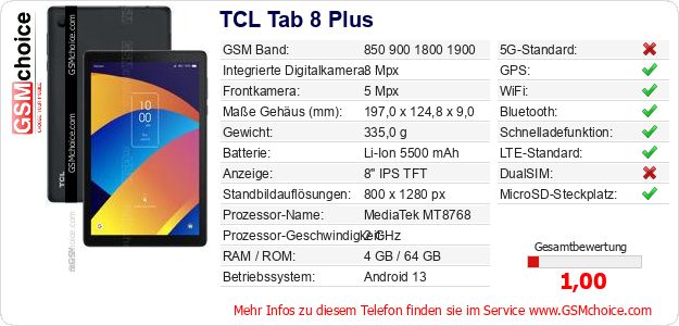 Hast du eigene Webseite? Willst du die Informationen über Standarddaten des Handys TCL Tab 8 Plus irgendwo veröffentlichen? Das ist sehr einfach. Du kannst das Bild herunterladen oder kopieren und auf der Webseite folgenden Code hinzufügen:Das Einfügen von diesem Code verursacht das Anzeigen von dem folgenden Bild: