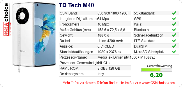 Hast du eigene Webseite? Willst du die Informationen über Standarddaten des Handys TD Tech M40 irgendwo veröffentlichen? Das ist sehr einfach. Du kannst das Bild herunterladen oder kopieren und auf der Webseite folgenden Code hinzufügen:Das Einfügen von diesem Code verursacht das Anzeigen von dem folgenden Bild: