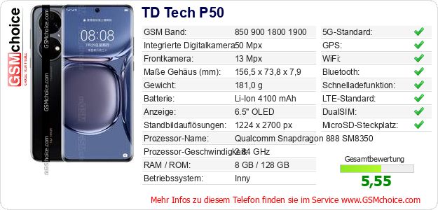 Hast du eigene Webseite? Willst du die Informationen über Standarddaten des Handys TD Tech P50 irgendwo veröffentlichen? Das ist sehr einfach. Du kannst das Bild herunterladen oder kopieren und auf der Webseite folgenden Code hinzufügen:Das Einfügen von diesem Code verursacht das Anzeigen von dem folgenden Bild: