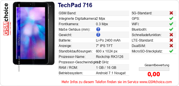 Hast du eigene Webseite? Willst du die Informationen über Standarddaten des Handys TechPad 716 irgendwo veröffentlichen? Das ist sehr einfach. Du kannst das Bild herunterladen oder kopieren und auf der Webseite folgenden Code hinzufügen:Das Einfügen von diesem Code verursacht das Anzeigen von dem folgenden Bild: