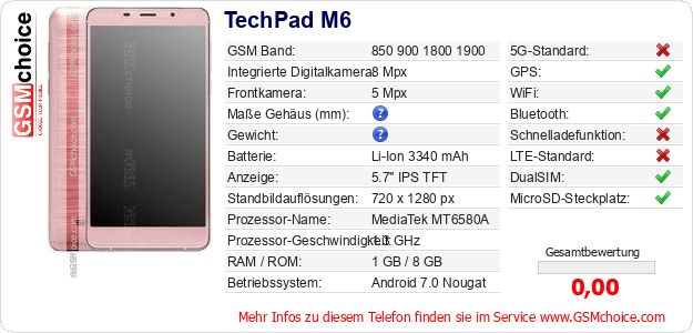 Hast du eigene Webseite? Willst du die Informationen über Standarddaten des Handys TechPad M6 irgendwo veröffentlichen? Das ist sehr einfach. Du kannst das Bild herunterladen oder kopieren und auf der Webseite folgenden Code hinzufügen:Das Einfügen von diesem Code verursacht das Anzeigen von dem folgenden Bild:
