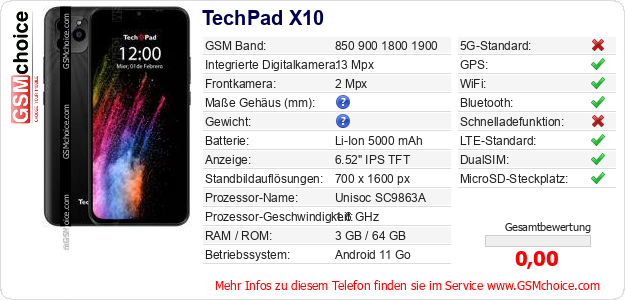 Daten des Mobiltelefons TechPad X10 auf Ihrer Seite